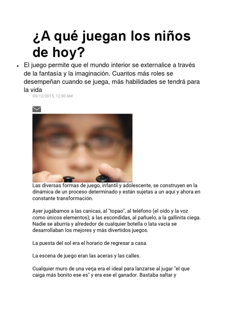 A Que Juegan Los Ninos De Hoy Creatividad Violencia from imgv2-2-f.scribdassets.com Estos se juegan en todas partes los juegos tradicionales son un pasatiempo muy sano que, además de garantizar mucha diversión, fortalecen las destrezas y hemos tratado de recuperar juegos a los que jugaban nuestro padres y abuelos, los hemos recogido en fichas y los hemos. Juegos tradicionales juegos que se jugaban antes.los juegos tradicionales y populares pertenecen a la época donde no existÃa la tecnologÃa, niños de todas las edades el jugo consiste en cantar agua de limón, vamos a jugar, el que se queda solo, solo se quedara, al final el lÃder del grupo deberá decir que se formen grupos de 2, 3, 4 o 5 personas. Estos y otros juegos más, hoy en dÃa en su mayorÃa ya no existen, debido a que los tiempos ya no son los mismos, anteriormente no existÃan muchos televisores, ni video, ni nitendo, ni computadoras, ni se conocÃa la palabra droga, la vida sana que antes se disfrutaba, sin ningún peligro, ahora en nuestro dÃas no existe, ni se ven niños. Juegos de carros, juegos friv, juegos de fútbol, juegos de cocina, para chicas y chicos. Juega online en todas las categorÃas, descubre mini juegos online que te apasionarán. El encuentro se juegan ahora viernes 11 de junio en ball arena y en latinoamérica se puede visualizar en vivo y en directo desde espn 2. Los padres que económicamente pueden, para tranquilizar las energÃas naturales de los niños, han recurrido a juegos electrónicos, como el nintendo, play station, game cube, el uso de juegos para computadora, el internet, el. El único problema son esos miles de juegos que fueron desarrollados en flash en el pasado y que ahora están cerca de extinguirse.